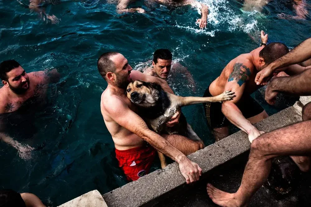 ‘‘This particular photo was taken on the day of the blessing of the waters in Heraklion, Crete. Thousands of people go to the ports and the seas on this day to witness the specific tradition. It was very difficult to reach the end of the port, where dozens of winter swimmers dive to catch a cross, which is believed to bring them blessing and good luck for the entire year. When the swimmers dived in to catch the cross, this dog also jumped in because it thought those people were in danger and wanted to save them. However, the dog could not climb back onto the port by itself, so the swimmers helped it .’’
